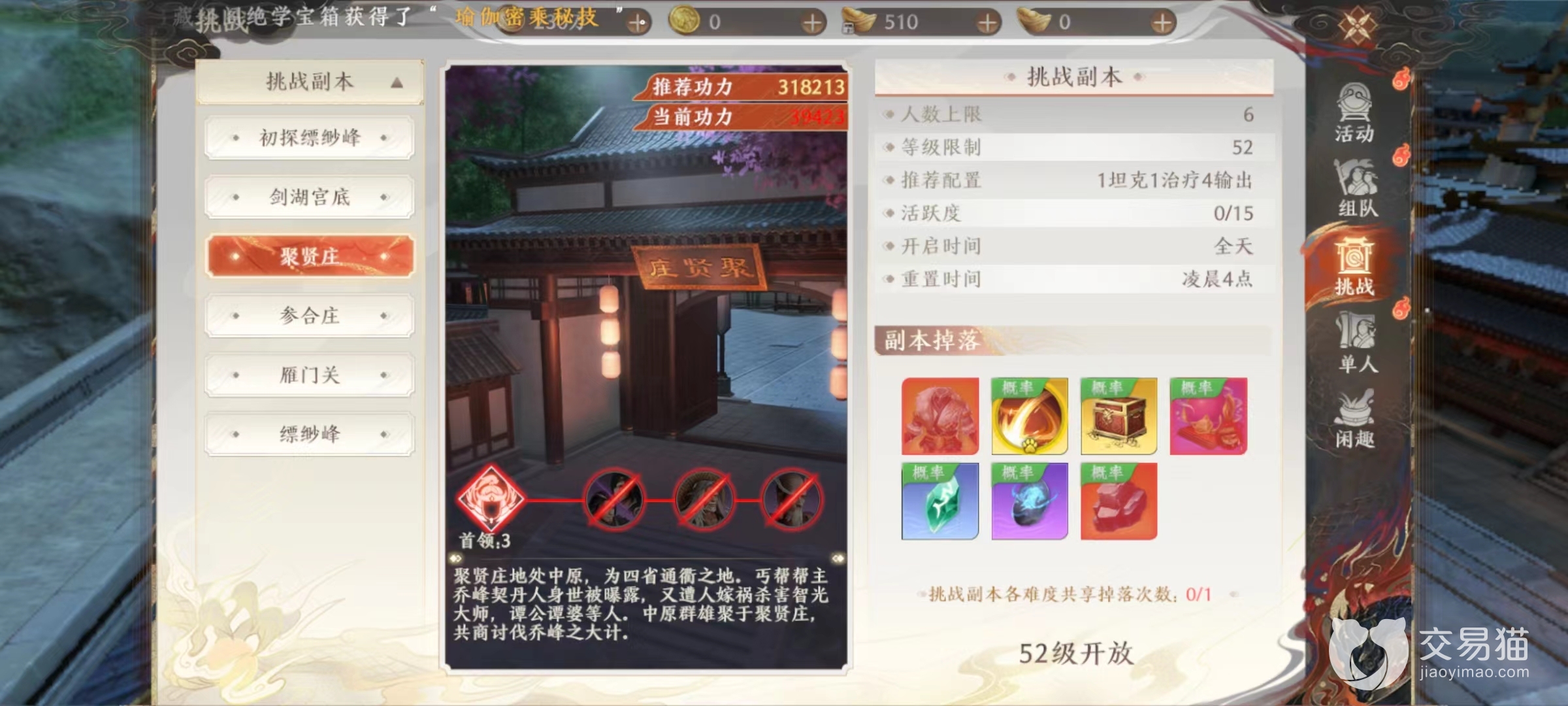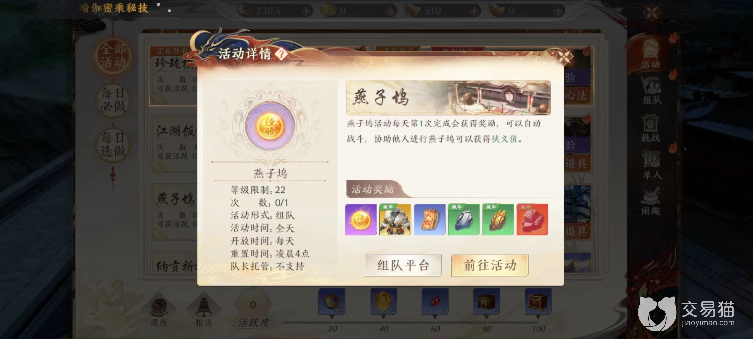 接下来活动就是在各种副本中获得,最主要为燕子坞副本和挑战副本这两大类,燕子坞属于日常活动,每天能够领取一次奖励,对掉落对应金色套装和玄铁、精金等道具。挑战副本难度比较高,需要达到指定功力和等级后才能开启,同样掉落金色套装,主动技能书和绝学宝箱等。这两项活动所得到装备属性比较高。