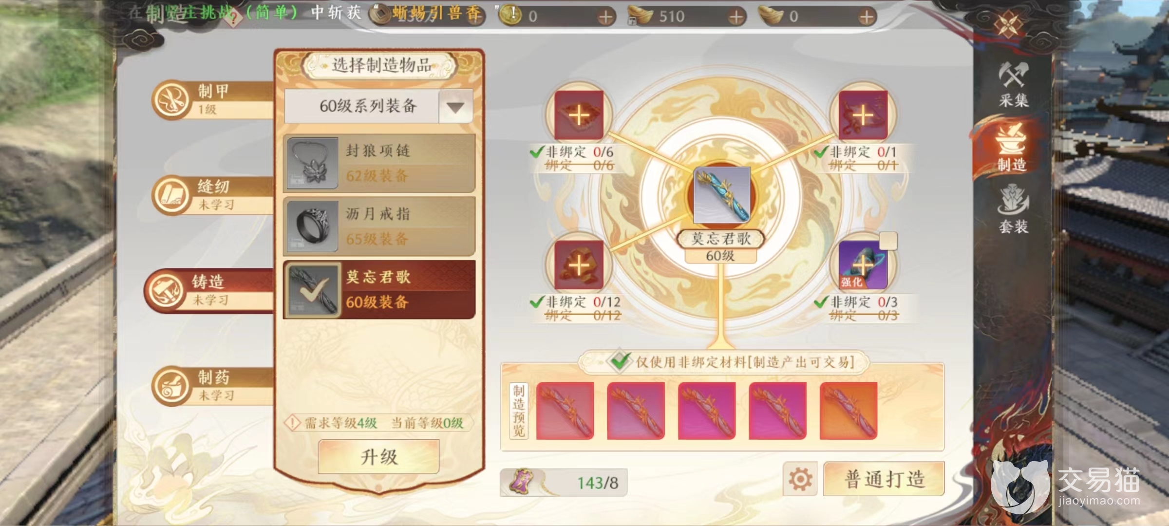 在获取方面最简单的就是通过生活技能,采集到原料自己打造,这样获取得到的虽然不是最顶尖类型,但是可以快速完成更新换代。拥有最基础属性去挑战其他副本,不然没有这样战力基础很难打通高难度活动。打造起来非常简单,如果自己缺少足够活力去收集对应原始材料,在交易系统中直接购买不会花费太多金币。集齐之后选择制造,分别有制甲,缝纫,铸造这三项,对应不同位置。