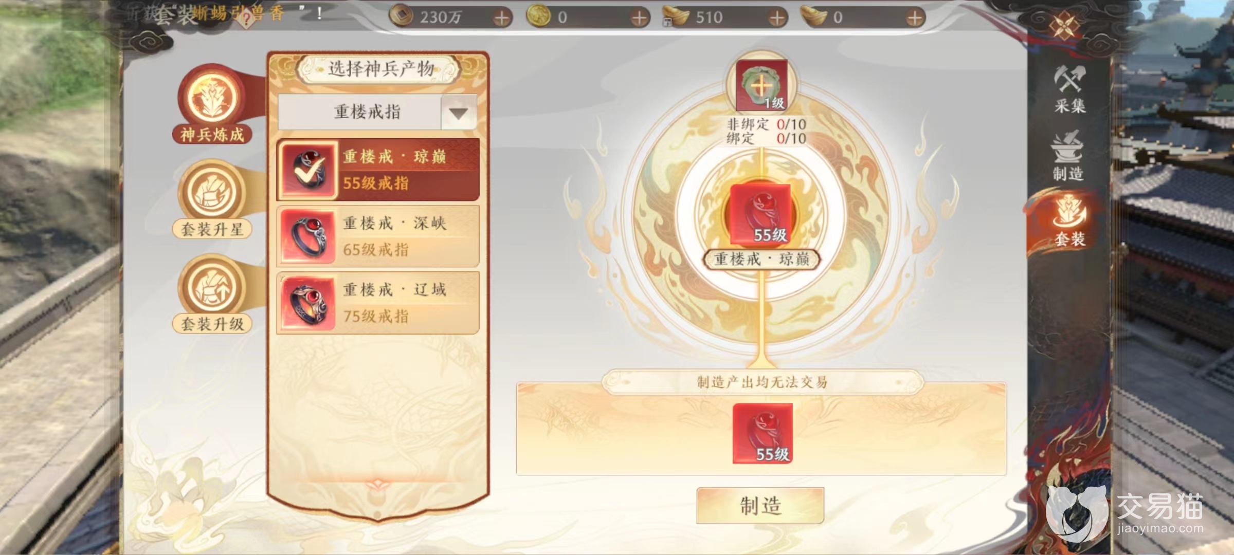 选好当前需要等级之后就能开始打造了,打造过程会随机出现不同品质,有白色,蓝色,紫色等最高能达到橙色。其他低品质没有任何作用,直接分解掉重新得到原料。制造中还有一项是套装,有三种不同位置,分别是戒指,护肩和腰带。需要消耗对应残片来合成,接下来为套装升星和套装升级,属于后期才能体验到的内容,前期可以先不用过多关注。