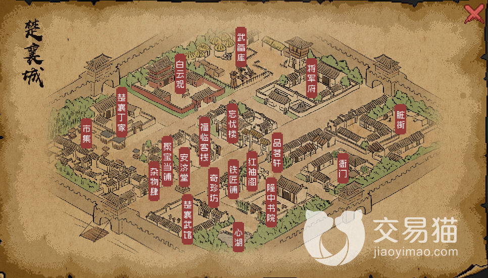 目前最主要的两个场景就是“无名小村”和“楚襄城”,它也算是游戏内NPC最多的几块地方了,其中前者还好,因为它属于新手村的性质,所以整体规模并不算大,只要于前期稍加探索并完成一些任务就能摸清楚其中的地形和人物,但后者的规模却比较大,而且其中势力错综复杂,祝来乍到的话很容易搞不清楚状况,其实它这里的地图还是很好获取的,只需要向送你来的车夫发起对话即可购买楚襄城地图。