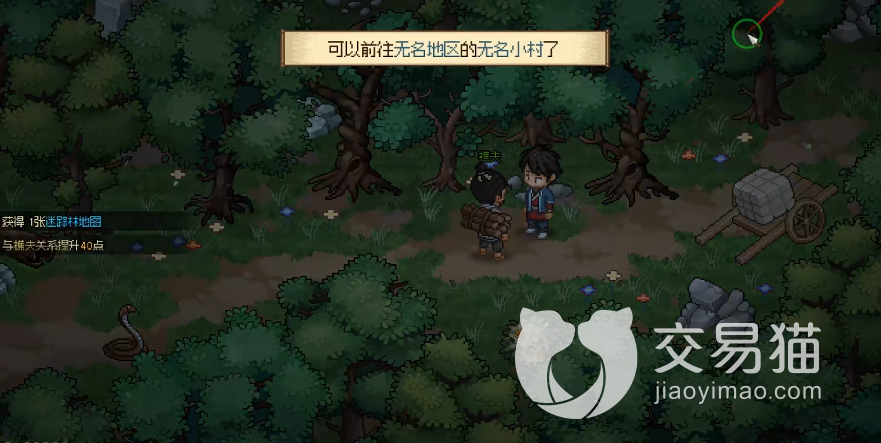 除了这个地图以外,前期还有一张地图也比较容易获得,那就是“迷踪林”地图,这片森林它属于无名小村附近的一块区域,其中遍布着蝮蛇和野猪,是一个前期升级以及刷肉食和药材的好地方,想要获取它这里的地图,需要在其中找到被蛇围攻的樵夫,救下他后与其对话即可获取迷踪林地图。