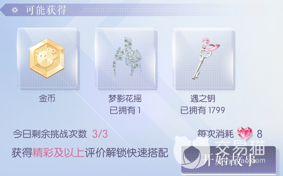 这一个关卡被称为迷云藏微光,玩家们每天可以挑战三次,获得精彩以上就可以快速完成搭配。解锁章节完成挑战,不过最好是达到完美,我们获取的奖励也会更加丰盛。完成挑战之后,玩家们可以获取到金币,遇之钥,还有梦影花摇,不过获取也是有一定概率性的。想要解锁困难章节,首先玩家们就需要先通关普通章节,之后我们再切换到困难程度就可以开启挑战了。困难与普通的剧情是一样的,如果是老玩家的话,完全可以跳过剧情直接进行关卡的挑战。