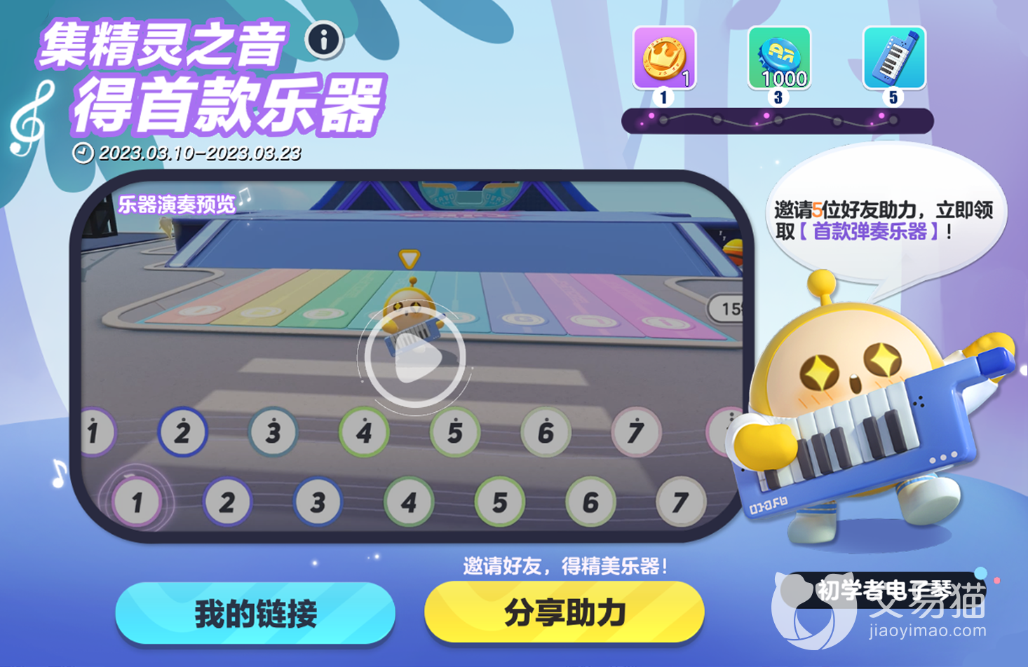 像这种初始乐器最为常见的就是电子琴这类了,在2023年三月是十号的时候,大家就可以通过邀请好友助力的方式来获取到电子琴,这个是游戏中的首款乐器,大家对弹奏比较感兴趣的话,就不要错过了。