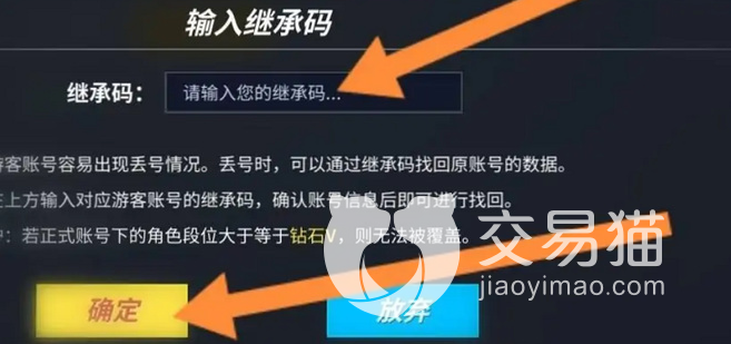 当然,如果玩家有了新号后还想着用它去继承原来的旧号,就得在退出那个旧号之前,点开屏幕左上角的头像,进入自己的信息界面,找到继承码;然后注册好新号,登陆游戏后,及时在铂金段位以上且钻石段位以下时,还是要进入自己的信息界面,先找到"继承码“按钮,然后点击一下便能进入相关页面,再去找到”使用继承码”的按钮,点击进入后输入正确的继承码,换号继承操作就正式结束了。