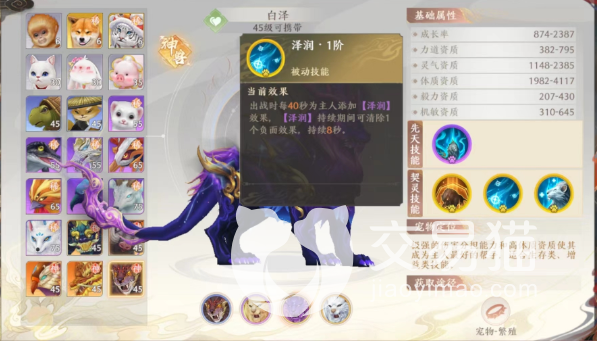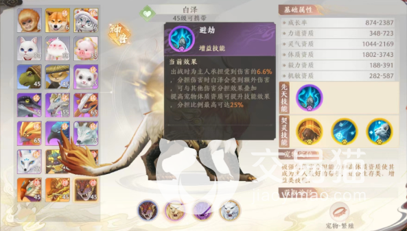 白泽的外表上是一个非常像麒麟的宠物,它的属性就代表了这是一个可以作为抗伤定位存在的宠物,它的先天技能就是避劫,这个技能也是一个抗伤害的技能,每一次可以为主人抵挡25%的伤害,这个百分比还是挺高的。