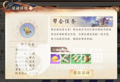 第二个方式就是加入帮会,大家加入帮会之后会有一些基础的任务做,这些任务一般都是比较好完成的,其中有一些贡献任务,大家只要将需要的物品交上去,就可以在上面获取简单的奖励,奖励中就有一些铜钱。