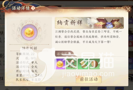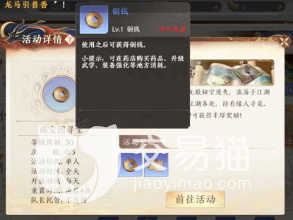 然后大家还可以通过活动来获取,因为游戏中的活动会经常性的更新,活动任务中有一部分也是会奖励铜钱的,大家可以按照活动去获取,例如大家获取的藏宝图,通过藏宝图去寻路挖掘出来的宝藏中就有一部分可以开出来铜钱。