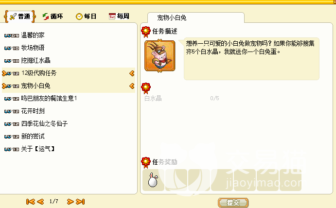 因此玩家们获得5个白水晶之后,就可以到任务当中提交白兔蛋的任务了。记得认真的把白兔蛋孵出来哦,相信兔年的守护神一定能够守护你的。