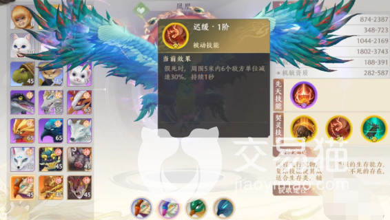 变异过后的凤凰有三个技能,第一个是鸿蒙,可以带来防御降低伤害的效果,第二个是迟缓,这个是一个群体技能,可以影响对面的行动,让敌人减速的同时不好走位,最后一个是炽血,这个技能是可以提升凤凰血量的,有这几个技能凤凰可以大大提升队伍的生存能力哦。