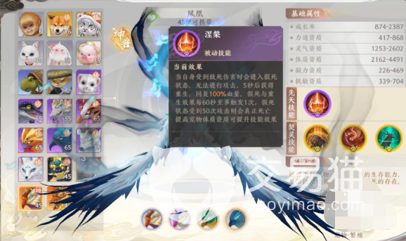 它的先天技能是一个传说中就存在的设定,因为在很多传说当中给凤凰是可以涅槃重生的,所以在这里它的先天技能在设定上也有点像这个传说,凤凰在受到致命伤害的时候会进入到一个假死的状态,过了五秒之后就可以重新进入重生的状态,不过血量没有回满就是了。