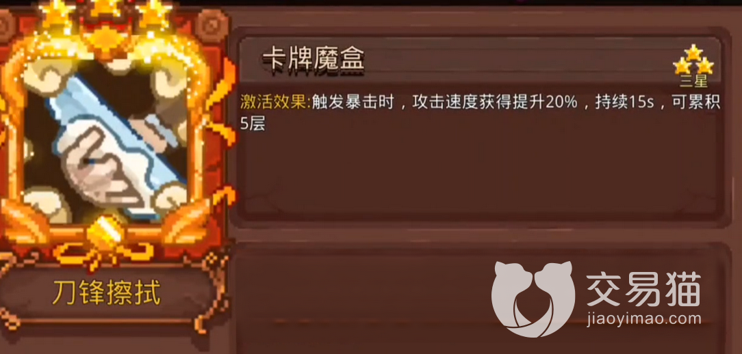 在这里先给大家介绍第一张卡,它的名字叫做刀锋擦拭,它在战斗中是能够触发暴击的,然后将攻速快速提升20%。效果持续的时间还是挺久的,总共有15秒。这个效果还能够叠加最高5层的层数,不过卡要达到满级才行,满级是3星。如果是在卡组里面的话,发挥出来的效果就会更加厉害。需要有一张叫作千锤百炼的卡能够组成羁绊效果,对于叠加来说,伤害将会没有上限。