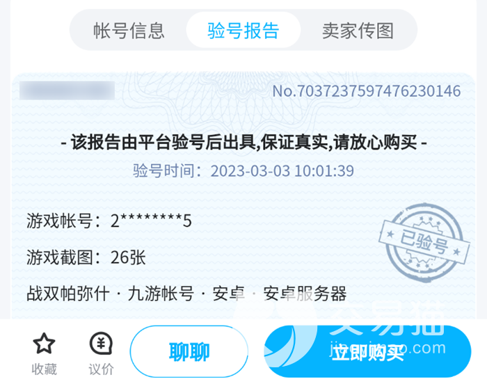 除了安全性之外,大家对于卖家的账号详情宣传也是有顾虑的。因为战双帕弥什这款游戏的收集内容和价值还是比较多的,那么多的机体和皮肤以及强大的武器,如果拿到手进入账号发现并没有我们想要的内容,到时候再想要申诉就会非常耽误时间。大家在交易猫买号的时候可以挑选一些带有验号报告的账号,都是由平台的交易员亲自登录账号去截取出示的,具有较高的可信度。
