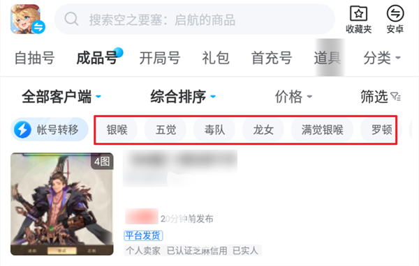 首先就是挑选账号方面了,游戏交易专区中的子频道还是比较多的,而且根据不同的需求大家也能够自由选择购买开局、首充、自抽或者是成品号。对于一些已经有了账号的小伙伴们而言,在这里还可以直接购买到一些强力的道具或者是包括游戏币在内的大量资源。如果你对这款作品比较熟悉,也能够通过点击上方的一些条件来进行快速筛选,比如说一些大家喜欢的角色、阵容或者是坐骑等,都是可以的。