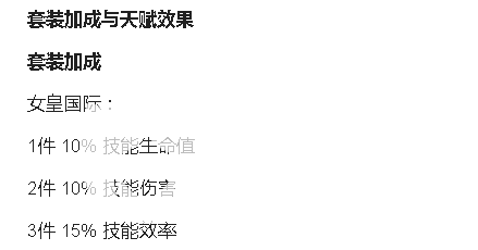 首先这个只有三件套,所以想要拉满特效也十分的容易,穿戴一件的话10% 技能生命值加成,两件会带来10%的技能效果,全部都拿到也就是三个部位会有15%的技能效率,当然这三个效果可以叠加获得,这也是很多作品中的非常常见的一个设计了吧。