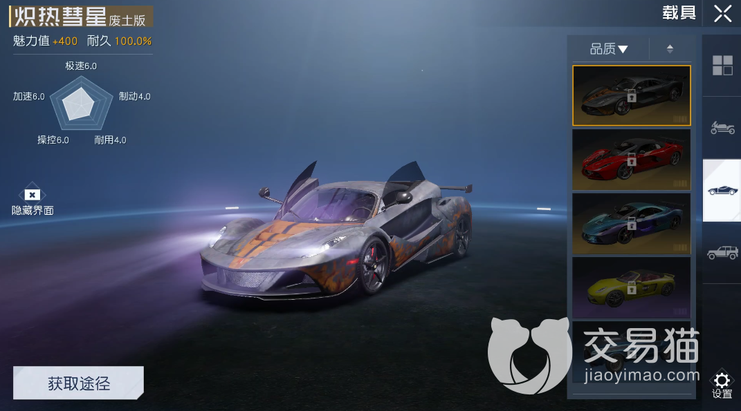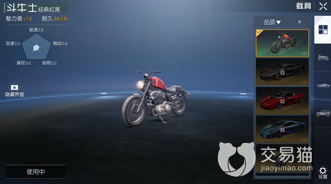 更换其他车辆的方法也很简单,只需要点击对应车辆的图标即可,目前车辆类型有三种,摩托,跑车和越野车,想快速找到某一类型的车辆可以点击左右侧的图标,其中摩托,跑车和越野从上到下按顺序排列,点击对应图标后即可进入这一分类的车辆列表。