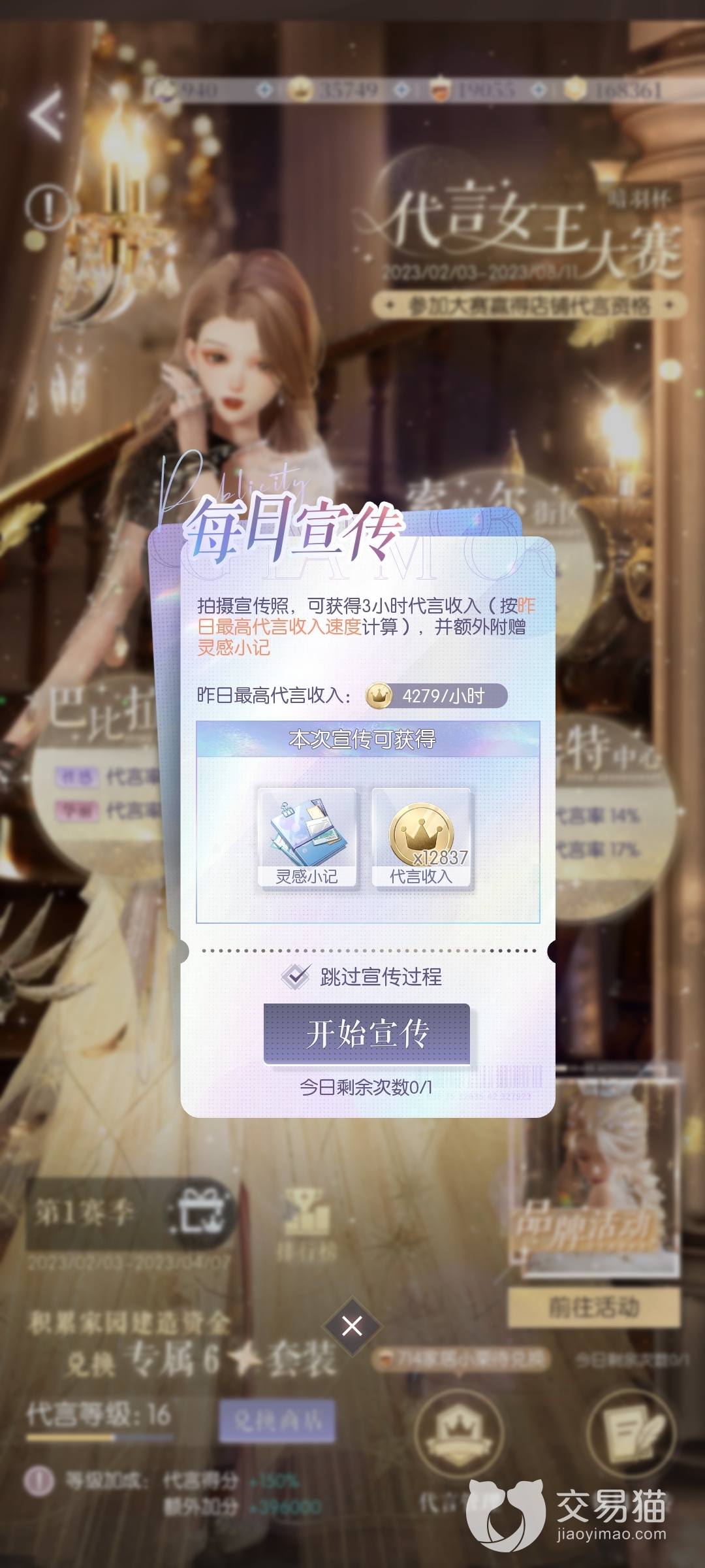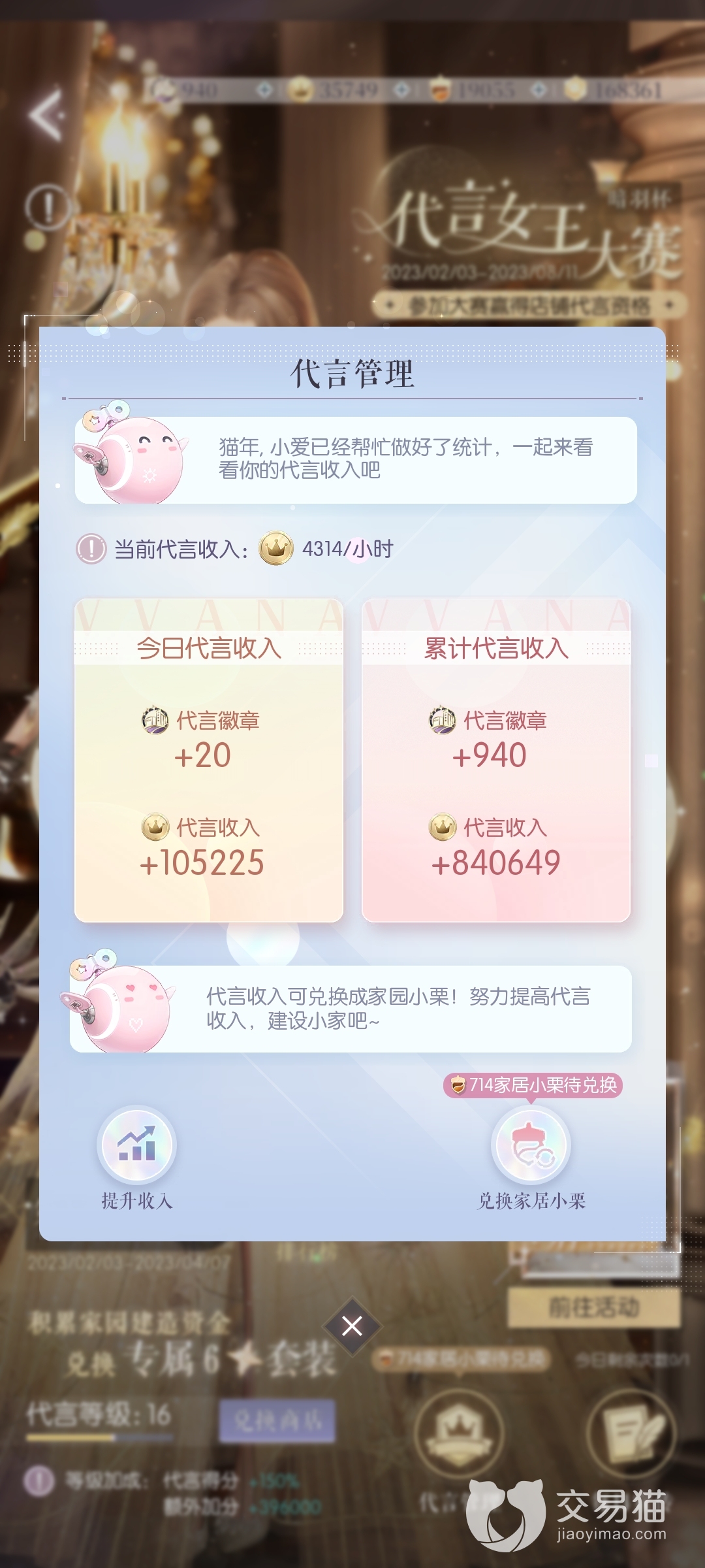 首先是获取方式,我们在游戏里做日常活动的时候,会发现有一个叫做“代言女王”的活动,这也就是家具小栗的主要来源了,我们可以在这里参与关卡获取“代言收入”,然后再将这些代言收入全部换成家具小栗。