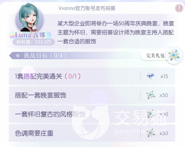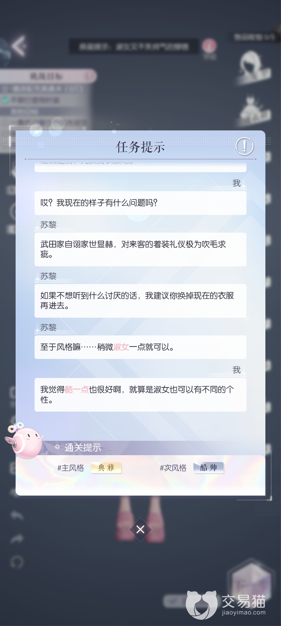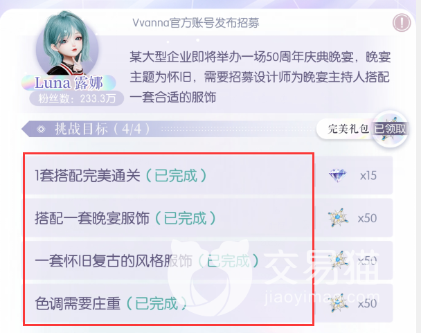 比如怀旧跟庄重这两点我们就可以同时完成,但前期在晚宴服饰上,色彩是比较偏明亮的,所以我们这一个任务可以选择第二次做,至于完美通过,只要在任意一关完成就可以了,所以,想要通关这道关卡,最重要的就是要学会对症入药,如果实在不放心的话,第一次可以少装备些饰品,但是服装方面一定要选择评分较高的,