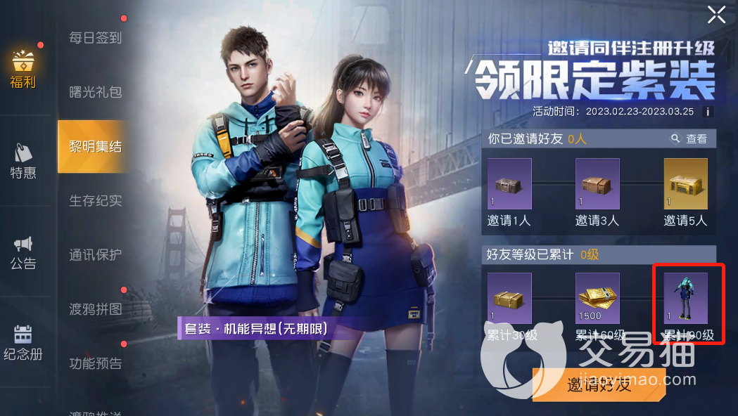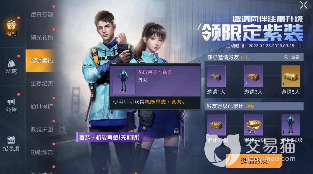 第二种方法就是“黎明集结”活动,在该活动中只需要你邀请好友加入游戏,并且他的等级达到90级那么就可以获取一套永久时装,这套时装的名字是“机能异想”,它属于紫色品质时装,外形还是非常好看的,而且也是那种男女通用的时装,