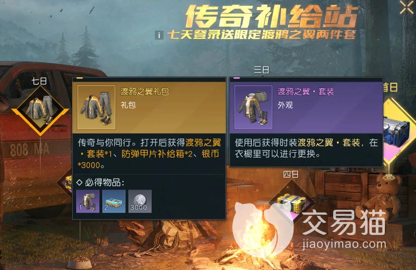 第三种就是七日补给活动,这个活动可以通过每天的上线来领取奖励,其中第七天领取的奖励宝箱中包含了一套永久时装,它也是紫色品质,名字是“渡鸦之翼”,以黑金两种颜色为主基调,而且它是和电影明星联动推出的活动,因此穿上它后你还能体验到一些拍电影的既视感。