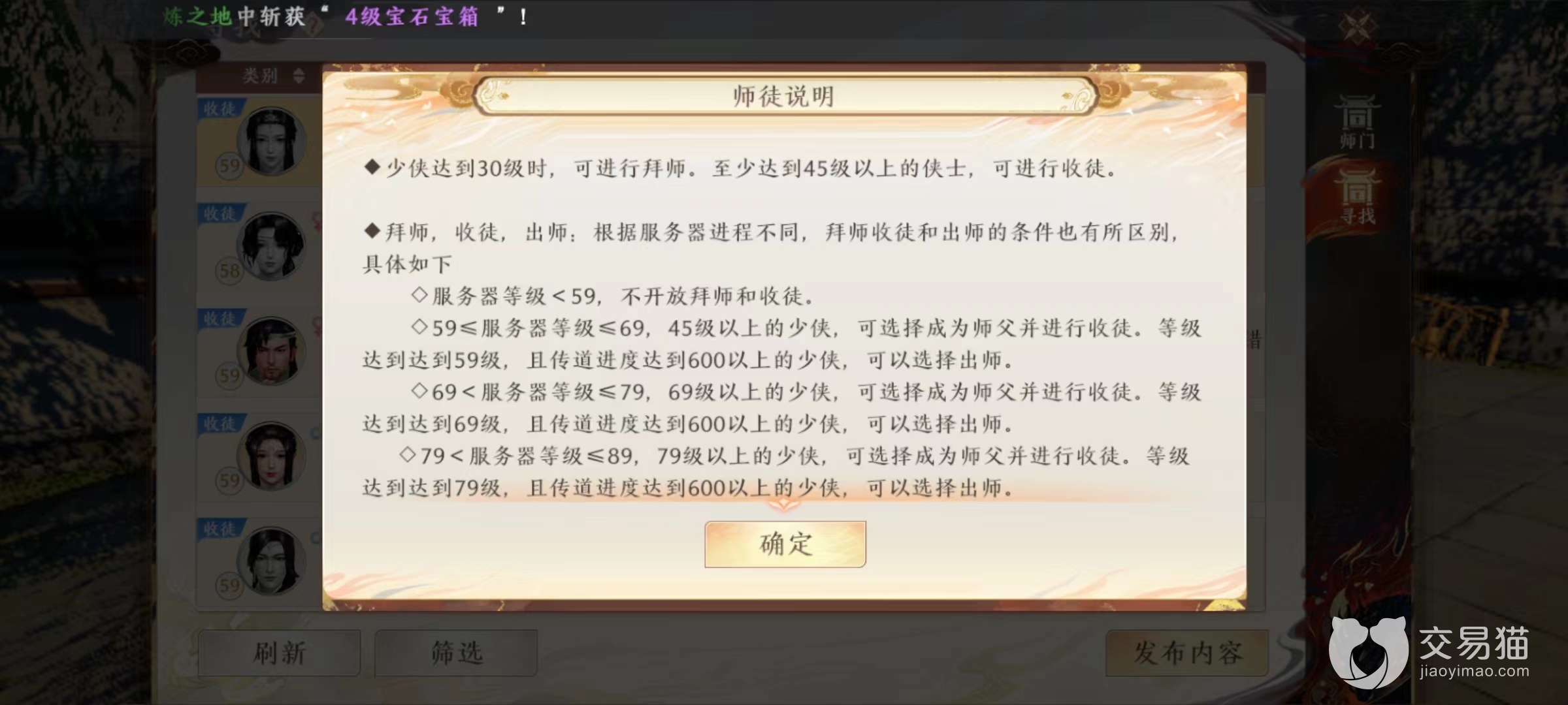 相互关系达成之后,进而要进行的就是出师,此条件根据所在服务器有所不同,当服务器最高等级小于59级时,这一系列功能均不开放。当服务器等级超过59之后才能进行,要想出师需要徒弟等级达到一定程度,并且双方传道进度值满足600点以上,才能成功达成目的。之后无双方都将获得一笔非常丰厚奖励,作为引导者奖励要更有价值一些,还有额外授业点获取,在兑换商店中兑换其他道具,这也是很多稀有物品的主要免费获取途径。