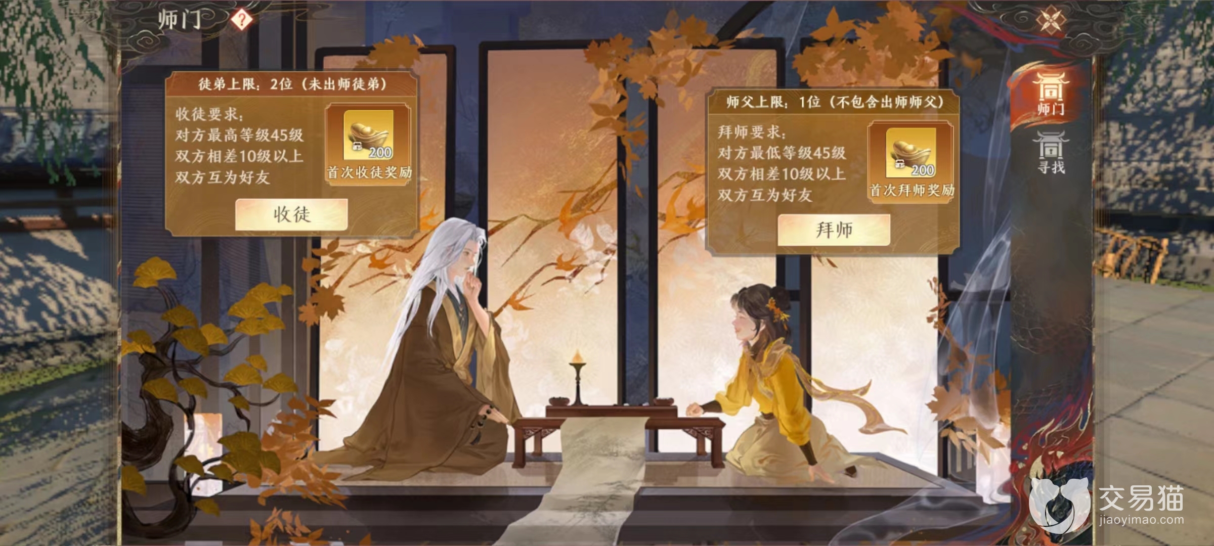 师傅和徒弟之间要存在等级差异,玩家等级达到30级时就可以申请进行拜师,而申请对象则是等级达到45级以上其他玩家,此时就具有了收徒资质。当双方达成协议后组队前往对应NPC处就就能达成关系。然后可以一起进行副本和做任务,这里要点明的一点是,副本中如果加入等级比较低的玩家,不影响其他正常收益,可以放心带领自己徒弟进入其中。