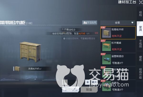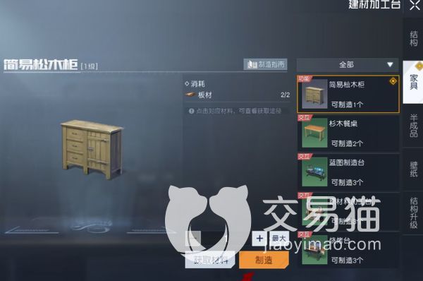 大家可以打开建材加工台,然后找到家具,在这里面就能看到各种各样的家具了,这个时候大家可以去找到想要打造的柜子,如果是等级足够的话,它上面就可以显示需要的材料,然后大家按照要求将材料收集齐,就可以回到该位置进行打造了。