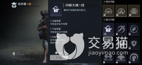 他在游戏中总共有两个技能,第一个是乞讨,当他在游戏中获得乞讨纸板之后,就能在背包中拿出来使用,做出不同的乞讨动作,这个时候,只要站在路边,就会有玩家路过,他给出一定的金币让乞讨者生活。第二个能力是开锁,它有一个工具,这个工具能打开任意一个锁,因此当大家在游戏中要是出现进不去的房间的时候,使用他的话,就能打开房间啦。只要大家使用该能力解开一个房间的锁的话,就能解锁开锁大师的天赋,这个天赋他是有等级的,在初期也就是一级的状态下,只能打开一些简单的门,就比如一级的军械箱,医疗箱,工具箱等,其中的任意一种,但若是随着角色的该等级越高的话,他后面还能撬开所有的对应等级的阀门,拿到其中好用的道具。
