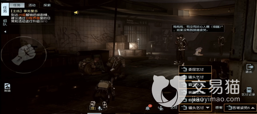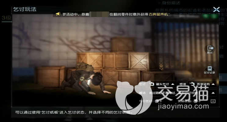 乞讨需要借助道具“乞讨纸板”,将纸板放到地上之后右下角就会出现相应的乞讨界面,玩家可以根据自己的实际需求来进行乞讨,这些乞讨的动作还是比较多的,无论你是喜欢委屈哀求还是霸气指点都可以找到对应动作。