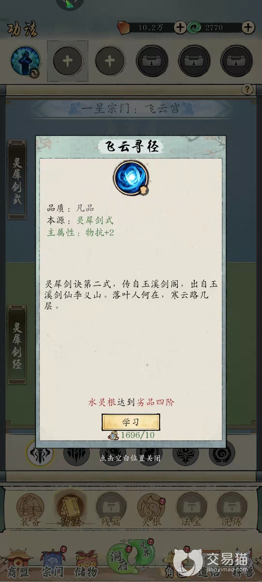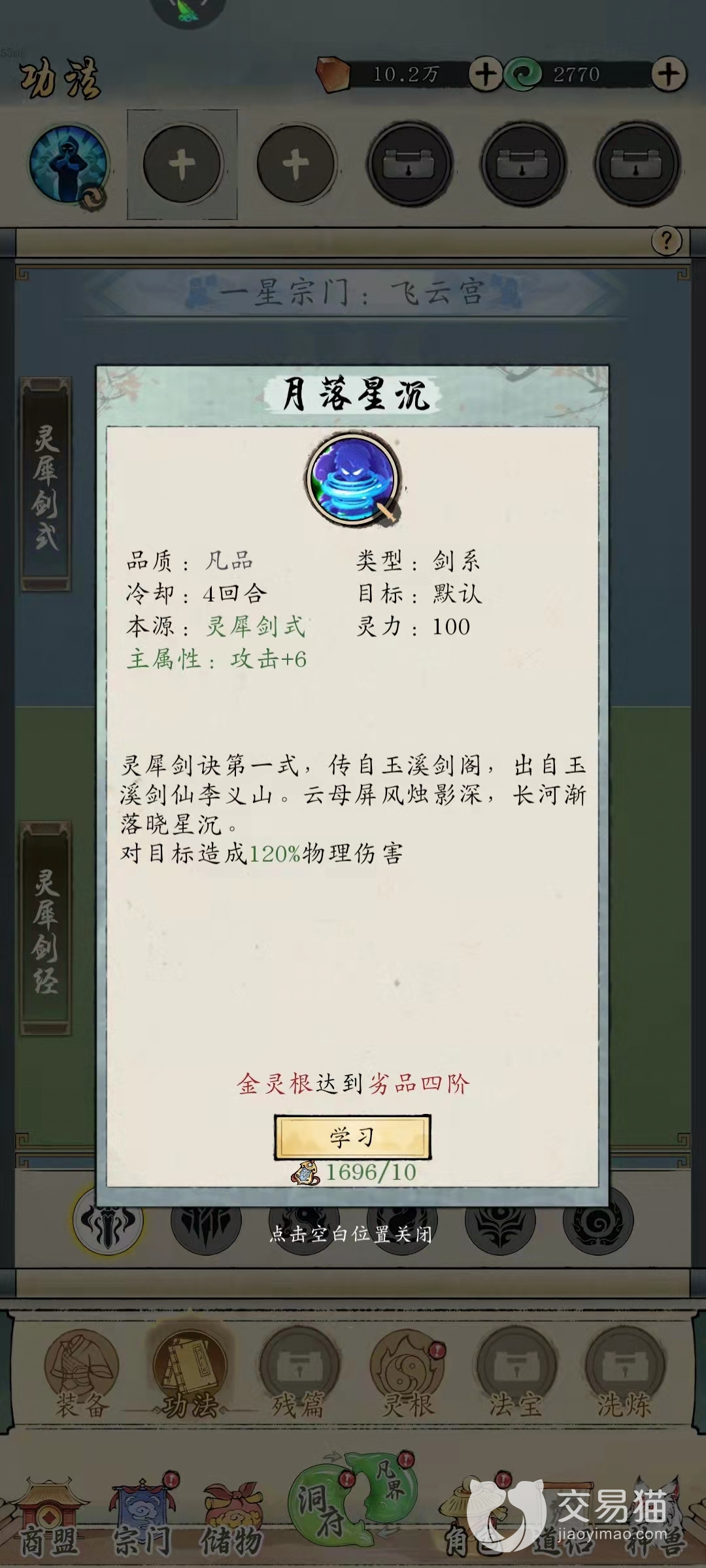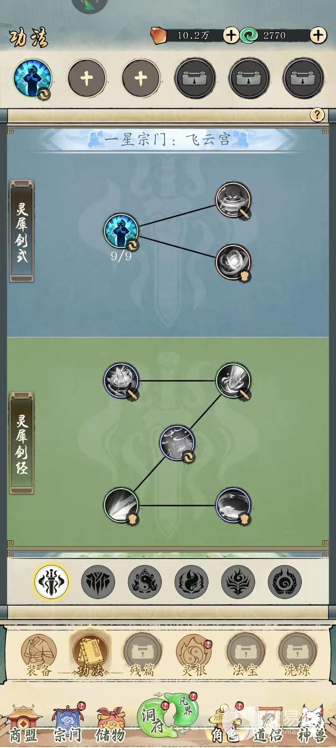 然后一个角色最多是可以携带六种功法的,这些功法都是可以进行推演的,不过最初只有一星宗门的灵犀剑式可以学习,其他则需要你的宗门星级达到一定条件,而且这些后面的功法普遍效果都会更加强力和丰富,这里建议大家前期选择进攻型功法进行推演,这样可以加快推副本的效率,然后等副本过的差不多了,中后期再开始补防御即可。