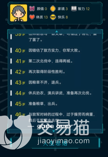 作为新手玩家来说,要知道的是,在角色到二十五岁的时候,想要后期发展压力没那么大,一定要将智力方面的点数加到四十五点以上,但是声望方面的点数也不能太低,因为这个角色中后期是需要具有一定的军事才能的,智力太低就会造成战争失败,而声望太低就会导致军中将士不服气、不信任。