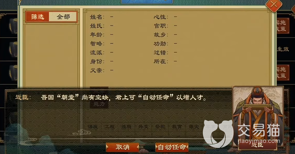 开局会随机刷新朝廷贤能,只要一键任命即可,初始送的人物都比较歪瓜裂枣,甚至很多角色会带负面属性,如果玩家刷出来的角色实在太差,可以提前使用集贤令招募贤能,但注意前期粮草不多,千万不要多抽。