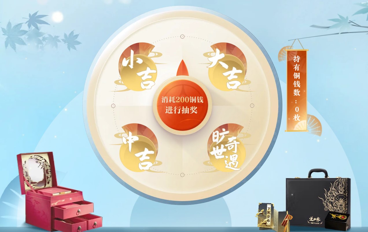 消耗200铜钱就能参加轮盘抽奖,奖励除了基础铜钱外,还有绑定纹玉,一些实体奖励比如说桌面的摆件、手机支架什么的,当然还有小概率获得二测资格码。当然你也可以把这些铜钱都攒着,有了一定数量的铜钱之后就可以兑换一些实体奖励、称号、头像框。库存数量有限哦,所以大家要抓紧时间参加活动,争取能获得这些礼品。