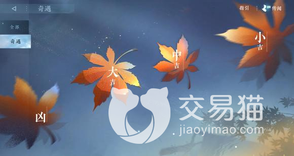先给大家介绍一下什么是奇遇,当大家进入游戏之后就可以在右上角的菜单里找到世界选项,之后点击就可以看到奇遇页面了,大家进入奇遇页面之后会看到四片枫叶,这四片枫叶上分别写着凶、大吉、中吉、小吉的字样,之后大家点击其中一篇树叶就可以看到这些奇遇任务了,不过在大家完成这些任务之前,它们都会显示为问号。