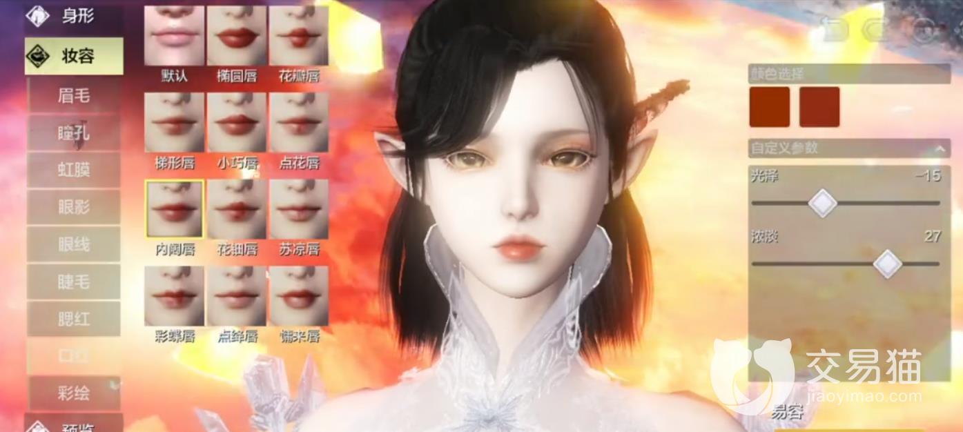 口红这里选择啵啵唇类型的内阔唇,光泽-15,浓淡27,颜色如图所示。