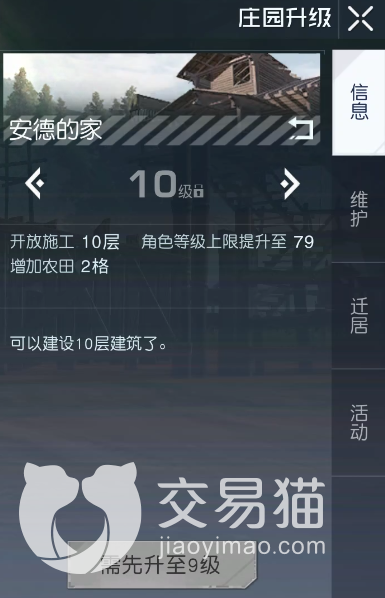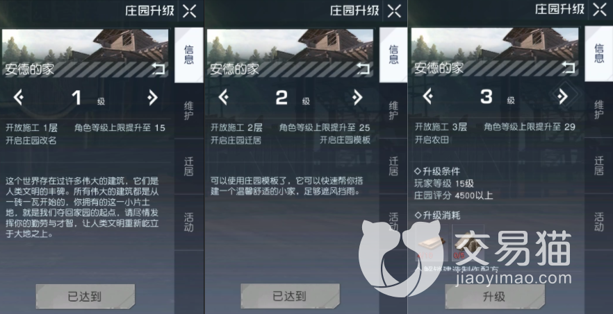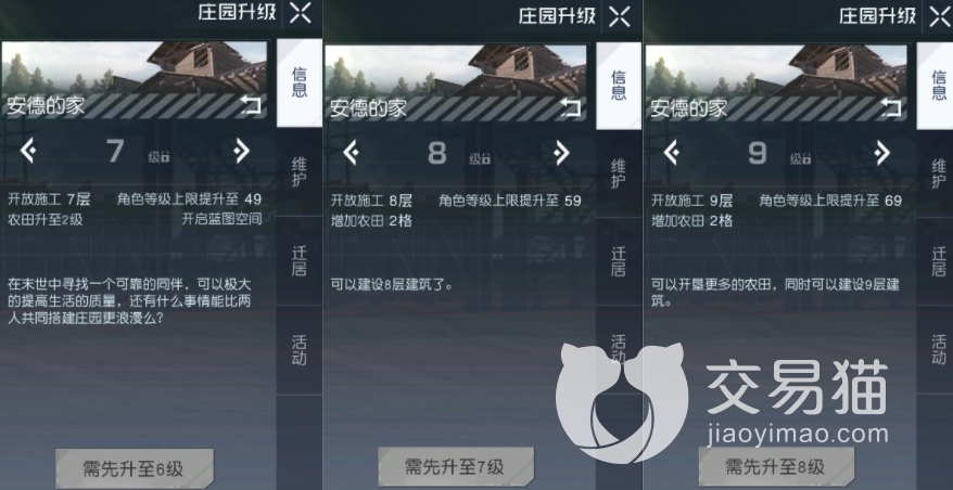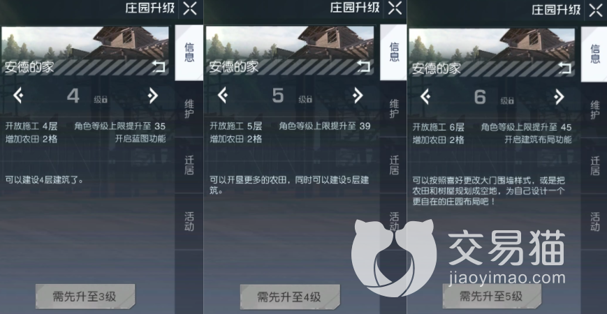 另外在施工楼层上,也会受到庄园等级的增益,能够施工的最高楼层与庄园的等级一致,比如一级最高能建一层,二级最高能建二层,以此类推。除此之外,每次升级庄园还会有一些独特的功能,其中包括一到三级的“庄园改名”,“庄园迁居”,“开启庄园模板”和“开启农田”。