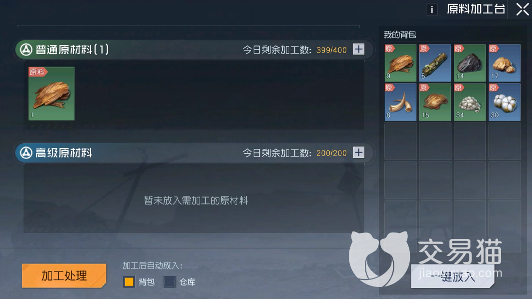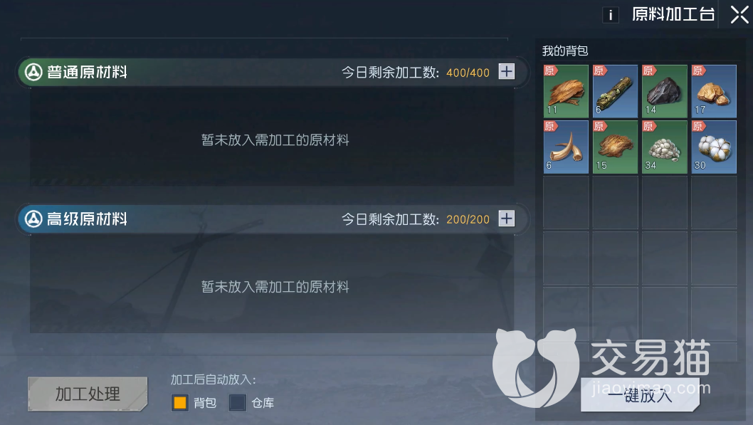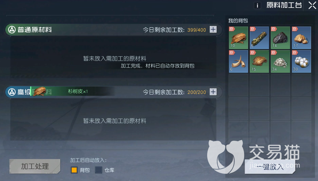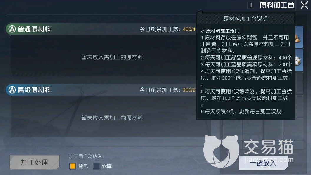 再就是加工台的具体用法,这个用法步骤本身还是比较简单的,只需要进入加工台界面后选择你想要加工的材料即可,加工过程本社你是需要一定时间的,高品质材料的加工可能时间会更长,另外还需要注意设置一下这些材料加工完成后的去向,如果背包满了的话建议先提前将去向设置到仓库之中。