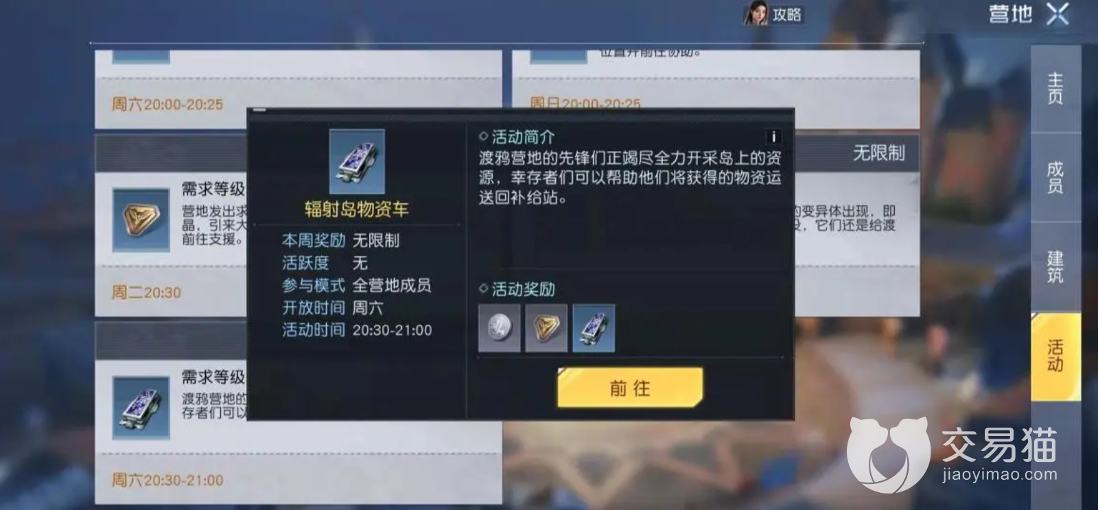 这个模式其实严格意义上来说,如果各位玩家没有加入营地的话,是不能开启这个任务的,算是营地专属任务。与每个星期六晚上八点半开放等级35级活动开启之后,在相应的辐射岛副本中会刷出不同品质的物资车,玩家们需要将物资车沿途护送到我方补给站获得奖励,期间踢人会不断派出杂鱼攻击和冲击物资,需要玩家们提前做好准备。