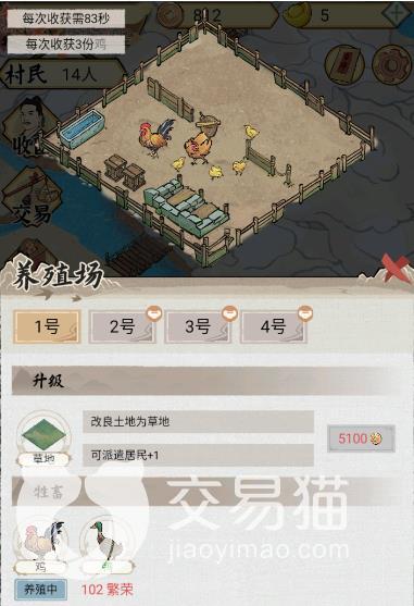 4、养殖场也是铜钱来源之一,玩家可以把这些养殖场的鸡毛、鸭毛之类的东西,制作成材料,也可以把肉类进行贩卖,或者制作美食,养殖场越大,你的产值就越高。