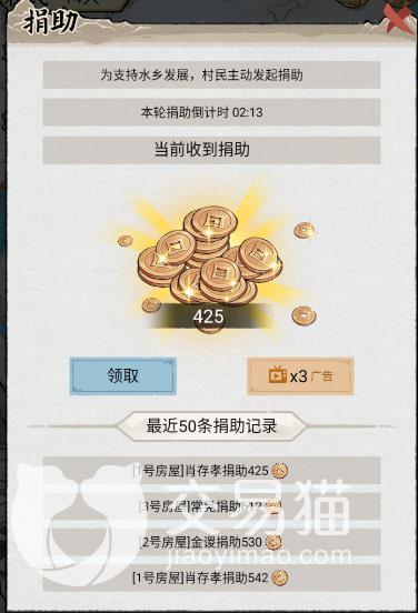 2、当你有一定资金以及繁荣度后,这个时候的村民就会产生幸福感,那么这些村民就会对你进行捐助,每一次的捐助都会得到大量的铜钱,而这些都是免费的,玩家可以直接领取使用,不过唯一的要点,那就是玩家必须要保持村民的幸福感,也就是你要不断的发展当地的经济以及扩容建筑,这样外来客就会来旅人,村民们也就有钱赚了,自然而然就会捐助铜钱了。