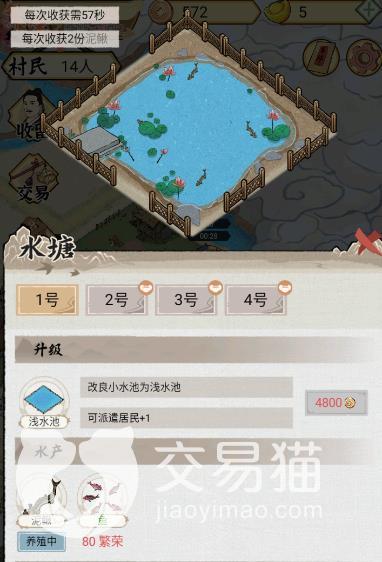 3、如果你可以解锁水塘的话,那么你就可以饲养鱼类了,把捕捉到的鱼类进行贩卖,也是可以获取铜钱的来源,后期还会解锁相关对应的菜谱,用鱼儿贩卖到客栈或者自己开店做生意等等,鱼塘是最重要的投资之一,也是来源最大的产值了。