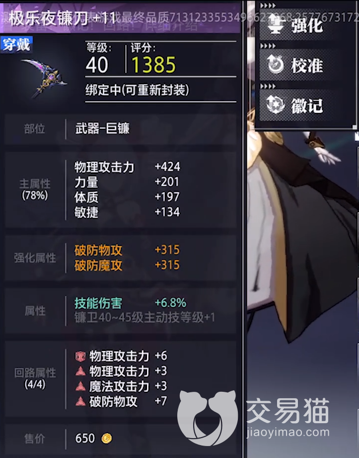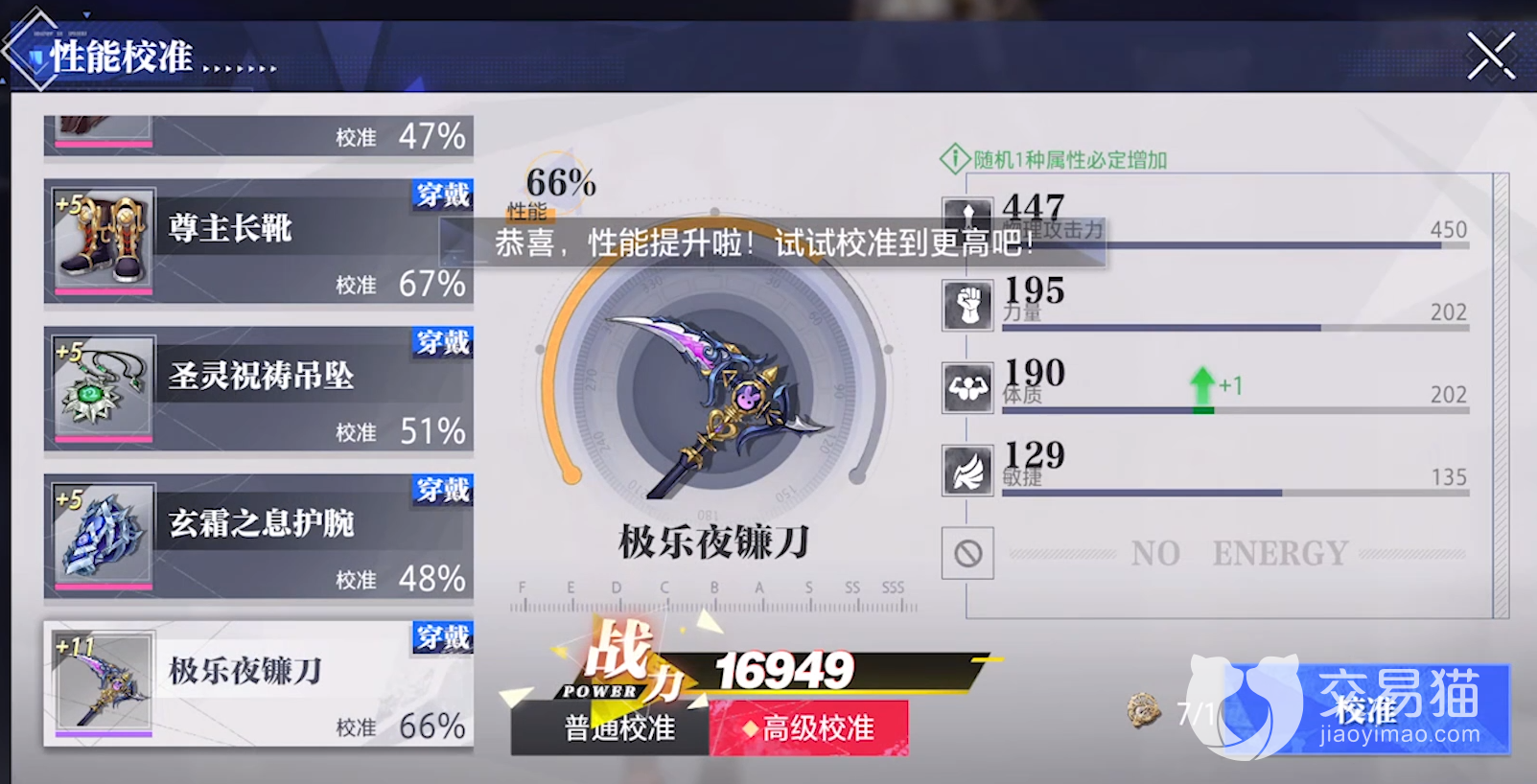 在装备的强化界面可以找到校准这个界面,主要强化装备的四个主要属性,这四个属性和玩家的战力紧密相连,成功之后直接会显示玩家战力上升,相反失败就会下降战力。