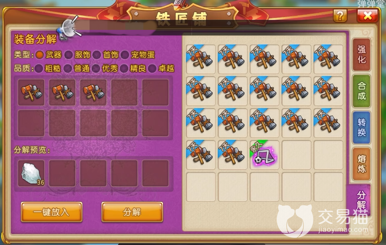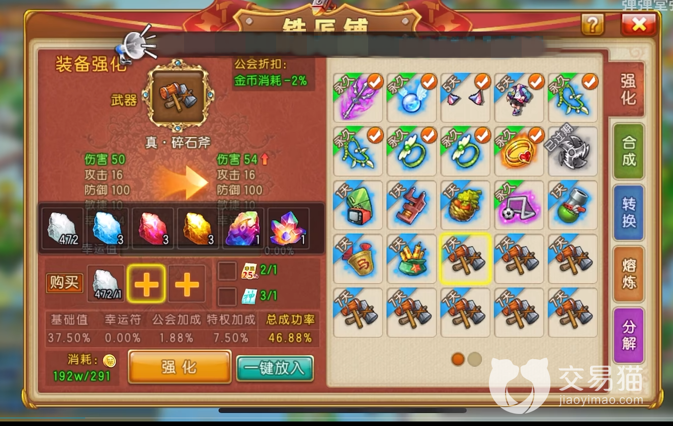 比如在商城当中购买这个碎石斧,需要买二十个,将每一个强化到2级之后在来到这个界面选择分解,一次能得到十二个石头,换算下来能获取二百四十个石头,数量非常的巨大,然后再来到强化的界面增强各位的装备。