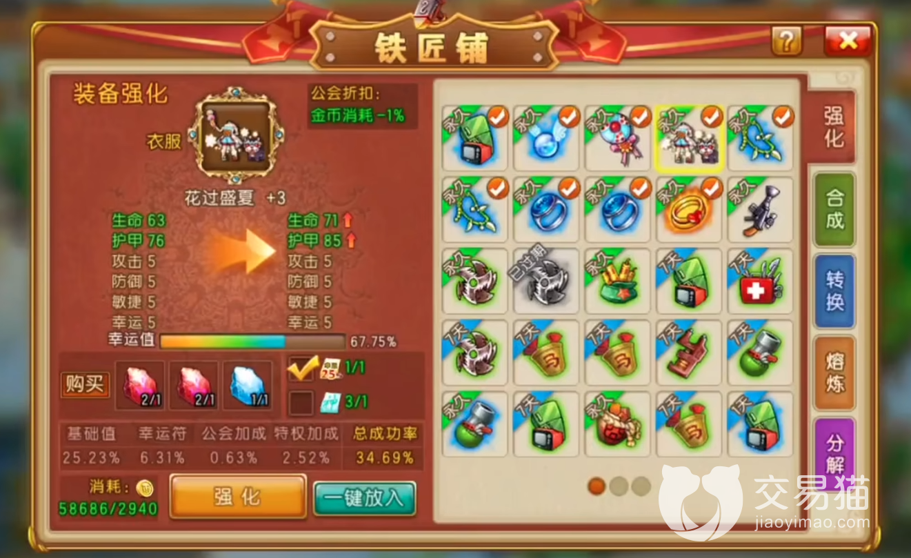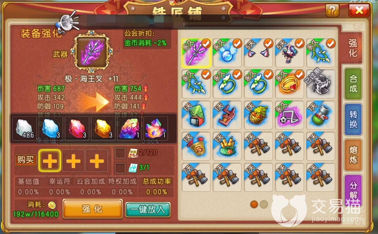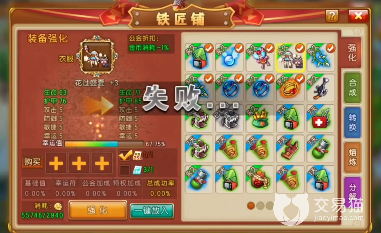 强化说实话非常的依赖运气,有时候不用幸运值就能强化成功,当然有的时候需要达到八十或者一百幸运才能突破,对自己的幸运实在不看好的,只有收集强化石和金币一条道路。