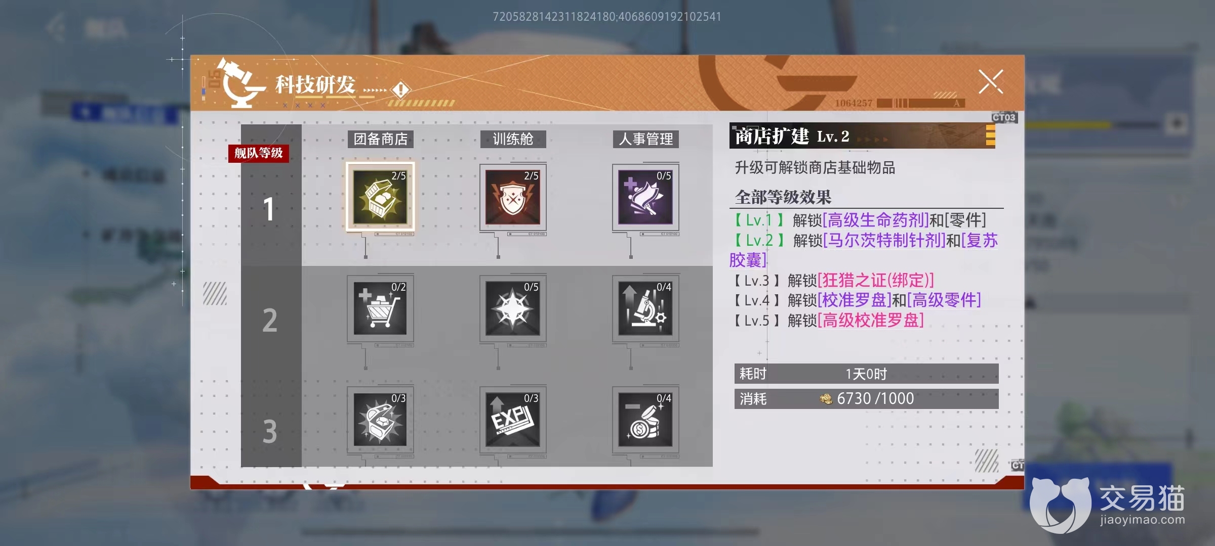 舰队管理成员可以消耗一定的舰队资金和一定的时间提升舰队的科技等级。科技研发有三项,分别是团备商店、训练舱、人事管理,各自对应着不同的效果。舰队同时只能研发一项科技科技,而且舰队科技不能大于舰队等级。