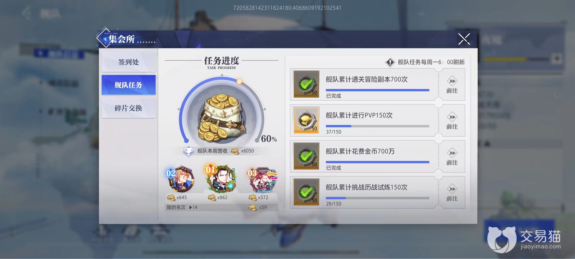第二个玩法是舰队任务,舰队任务每周刷新一次,全体成员一起完成,根据任务进度给舰队奖励舰队资金,个人也会获得飞空点的奖励。