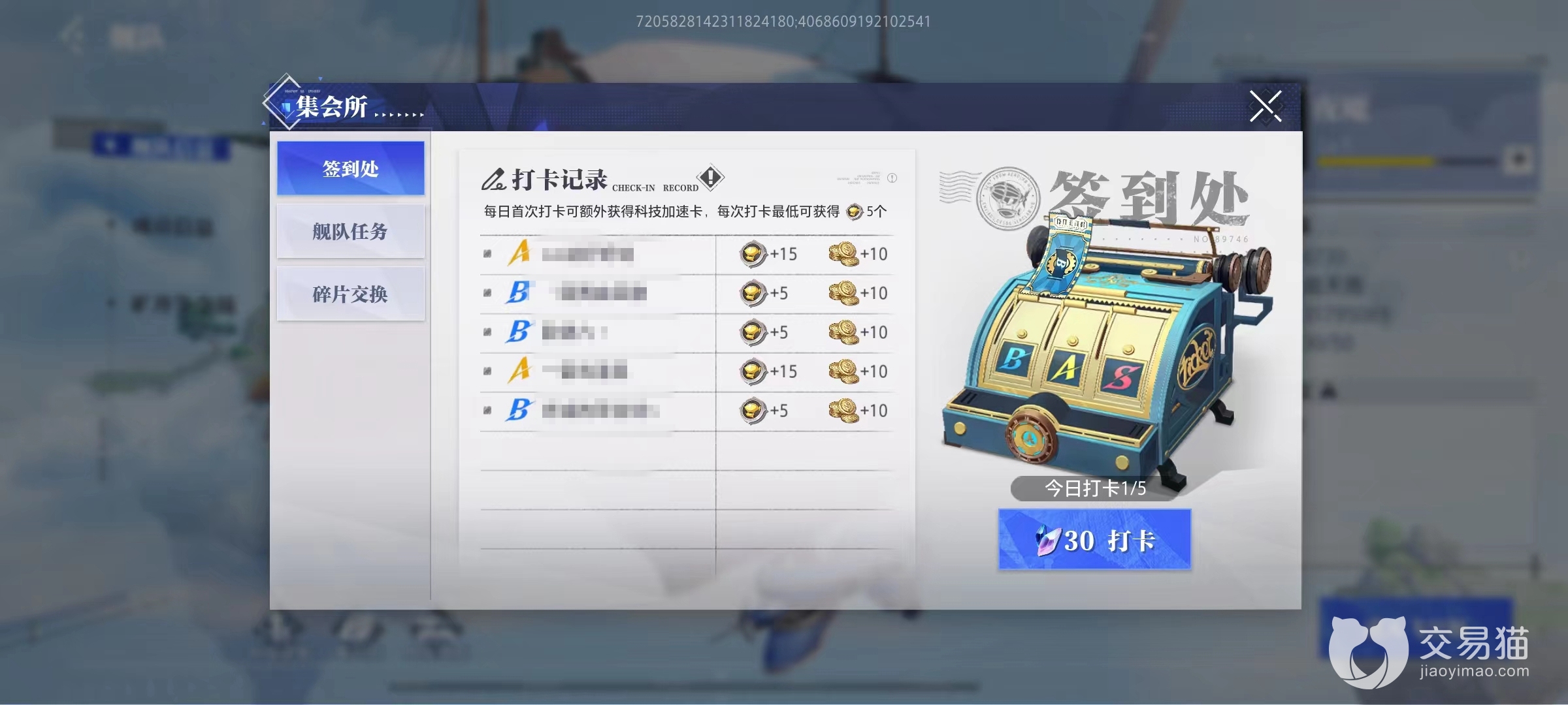 集会所中有三个玩法,第一个是舰队打卡,每个玩家每天可以免费打卡1次,总共可以打卡5次,其余四次打卡需要花费欧珀或者晶珀,打卡成功可以获得舰队资金、飞空点、工作加速包。