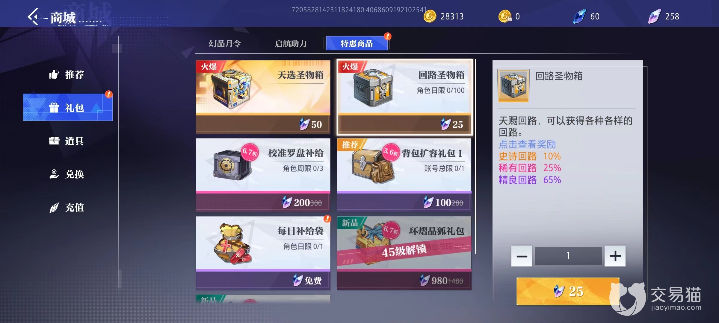 回路圣物箱是游戏商场里提高给玩家购买的回路礼包,会随机获得s级、a级、b级三个等级的回路。25点晶珀一个,大家想要高级的回路,购买途径是最快捷的了。