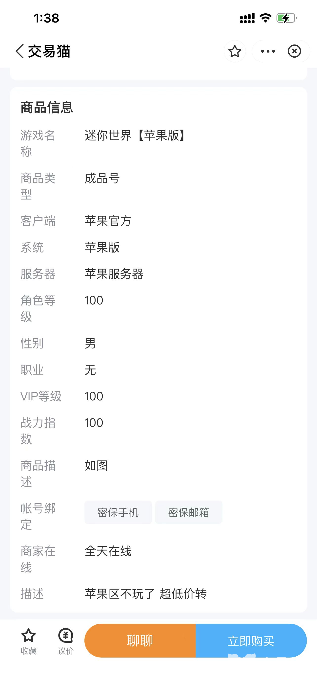 在迷你世界中,每个账号都有详细介绍比如等级、性别、职业、战力等信息,便于玩家更快速了解改账号信息。尤其是对于一些想从安卓专区换到苹果专区的或者苹果专区换到安卓专区的玩家而言,买个账号或许是最佳选择。