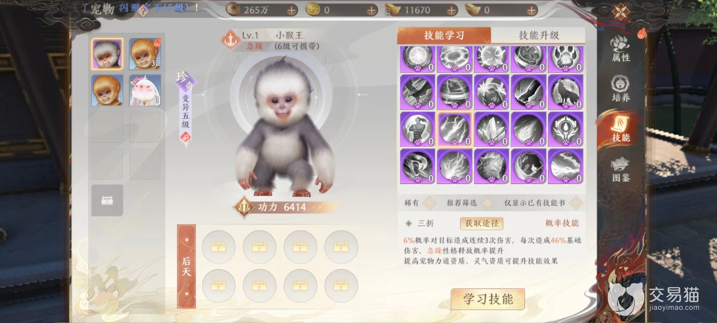 顺境使得旺财在自身血量高于70%时候提高会心攻击率,双缠则是有机率打出两次攻击,三折将连击次数再次提升,这些都能很好提高输出。毕竟注定了后期要更换的宠物,自然在打书上不用太过上心,再加上前期也没有太多资源去提升,这已经算最好结果。