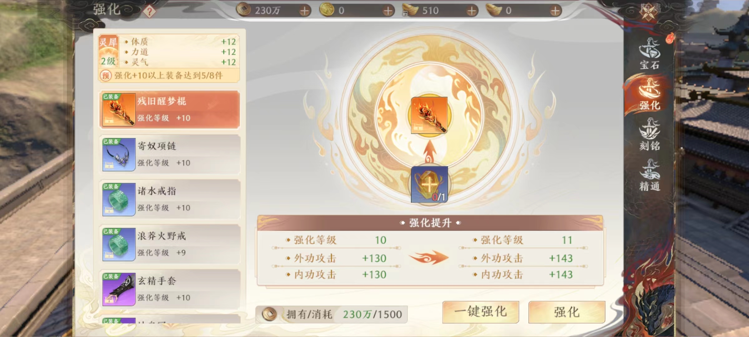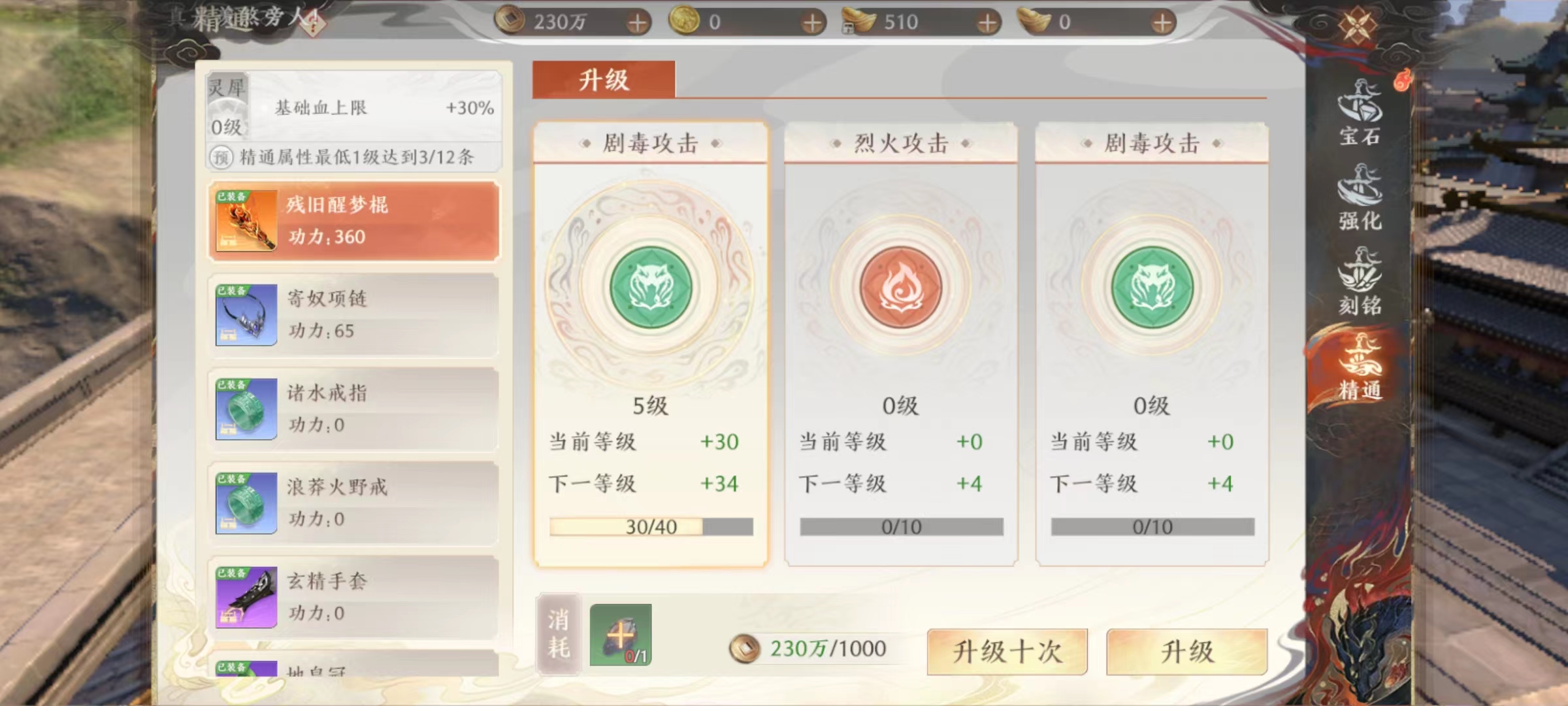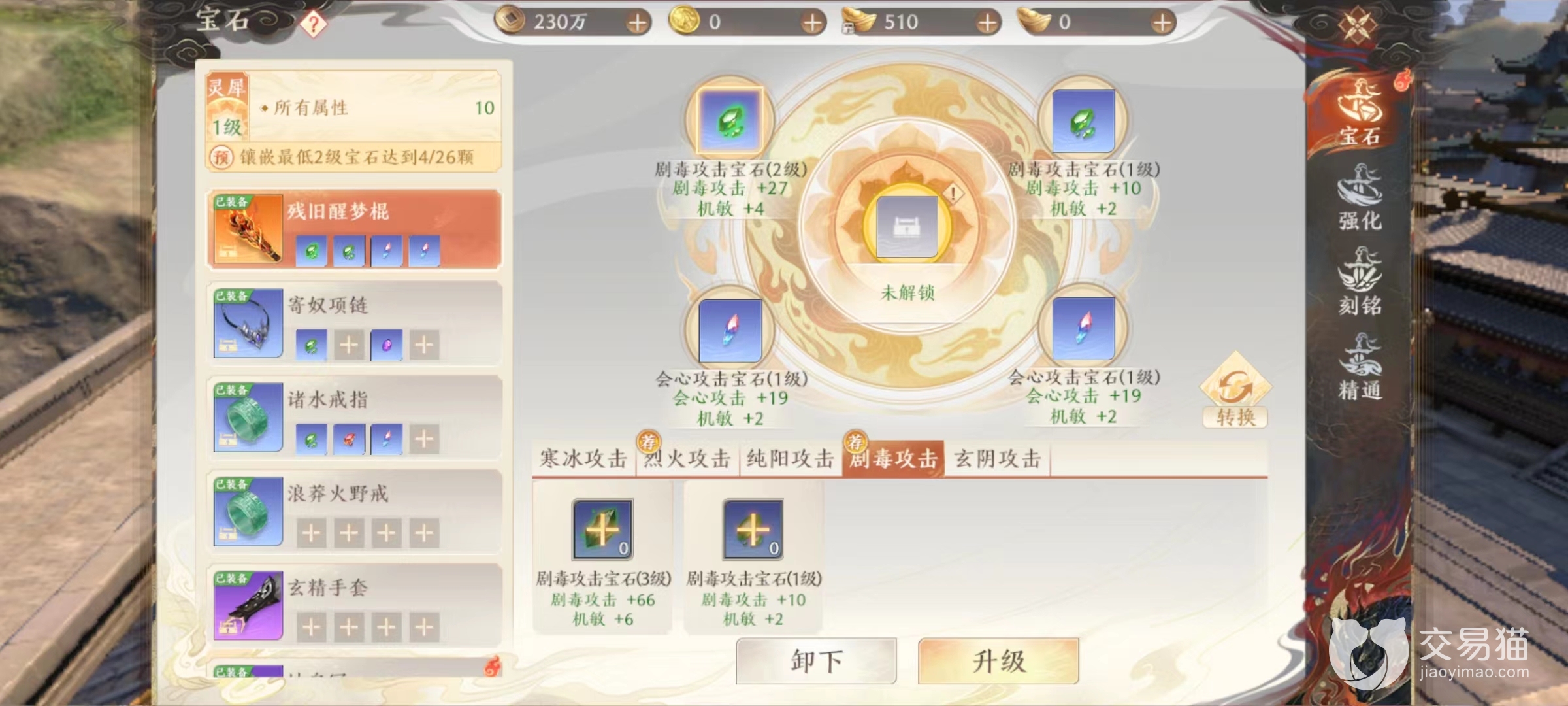在镶嵌玩法中,可以发现每件装备无论哪个部位,都可以进行镶嵌操作,有些已经开放有些则还处于锁定状态。中间那个凹槽就是今天介绍道具所镶嵌位置。其他常规内容都有对应属性提升,例如增加血量、攻击、会心以及命中等,但今天介绍的这个道具,提升点并不是这些方面。